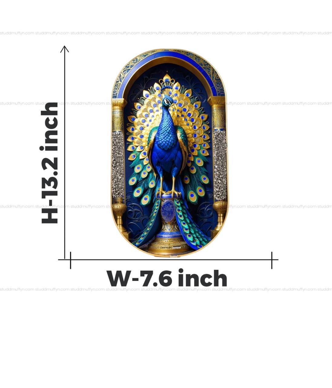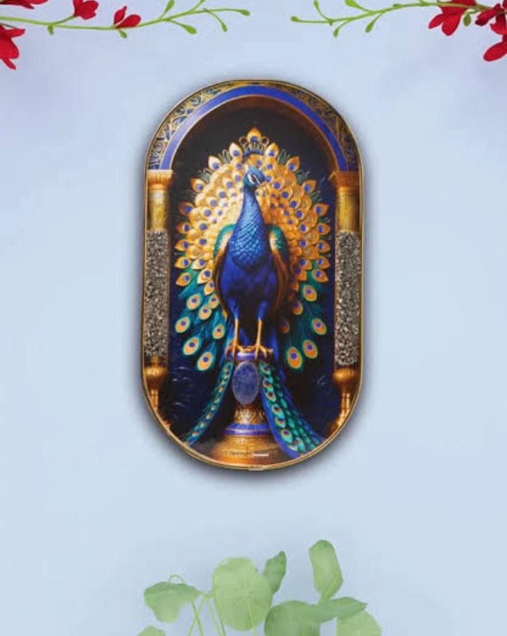 Design: The frame typically has a “capsule” or oval shape with an ornate background of the peacock’s iridescent blue and gold plumage.