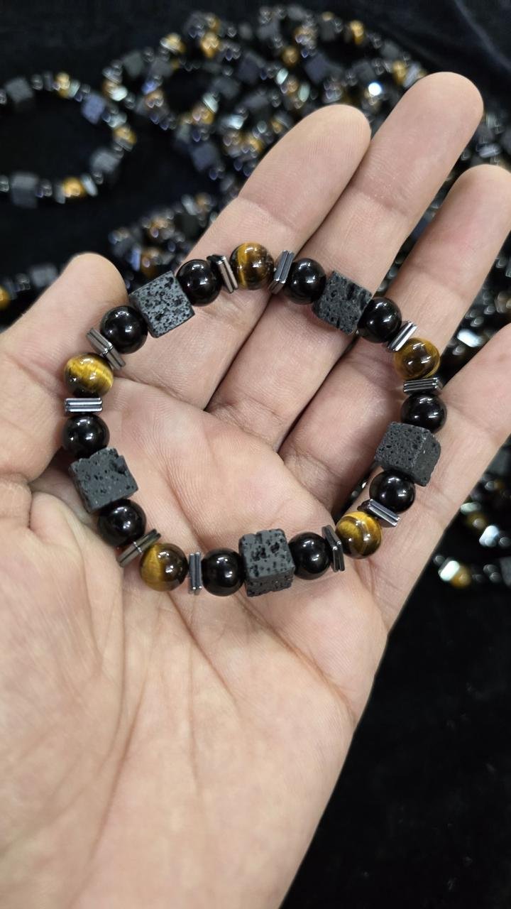Tiger Eye, Black Tourmaline & Hematite Bracelet of Best AAA Quality Natural Beads with Certificate of Authenticity. This stretchable elastic beaded bracelet is suitable for all. It is Energised & Activated to wear for Best Results